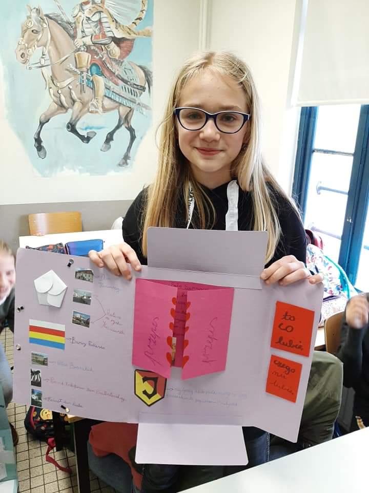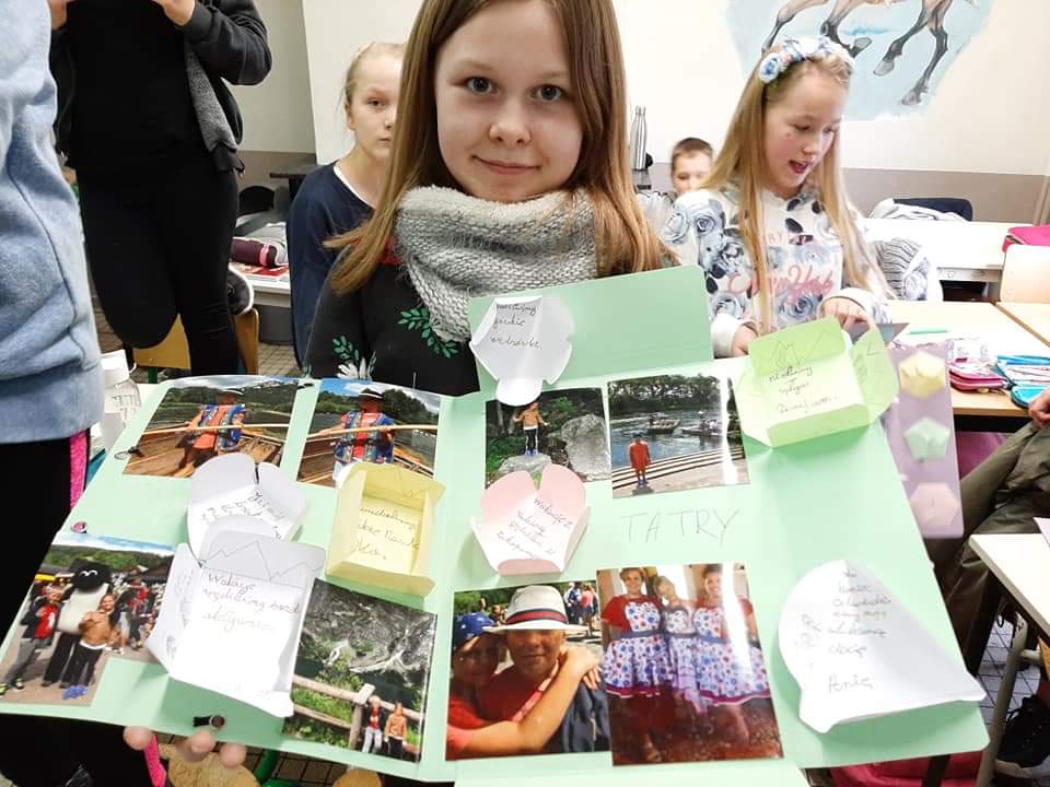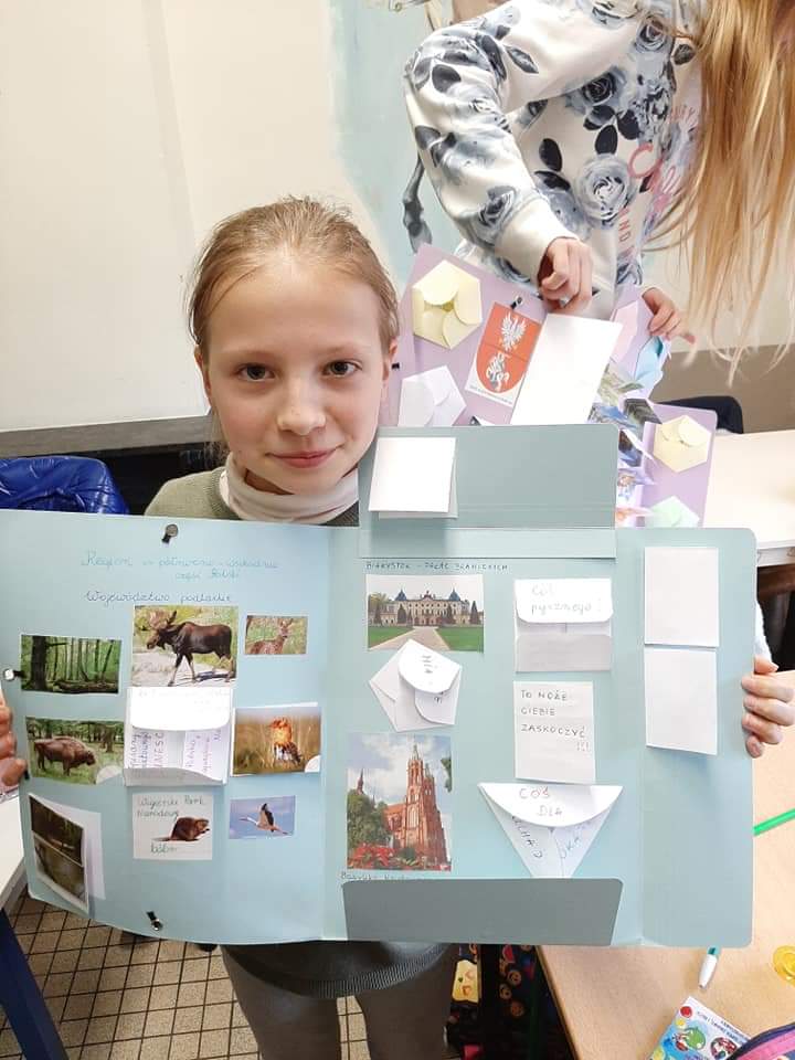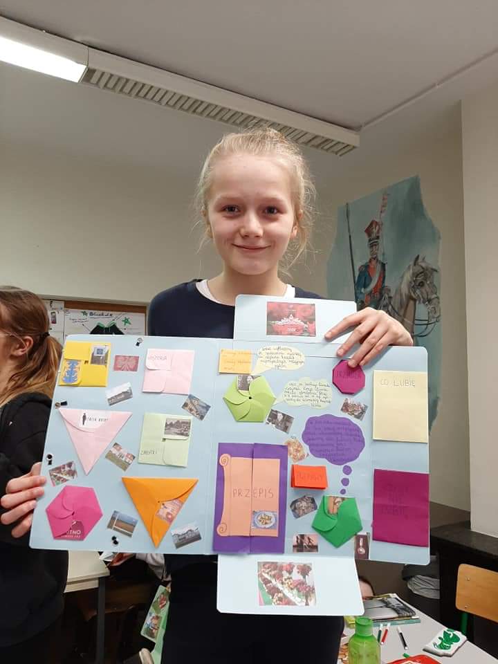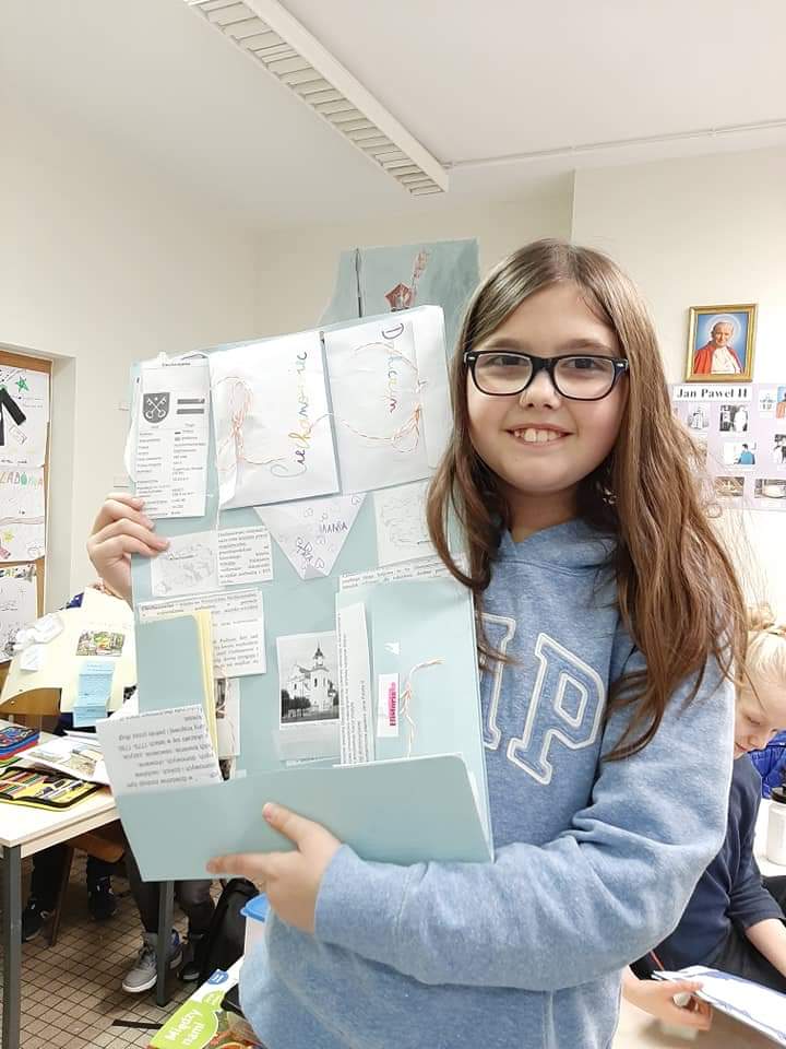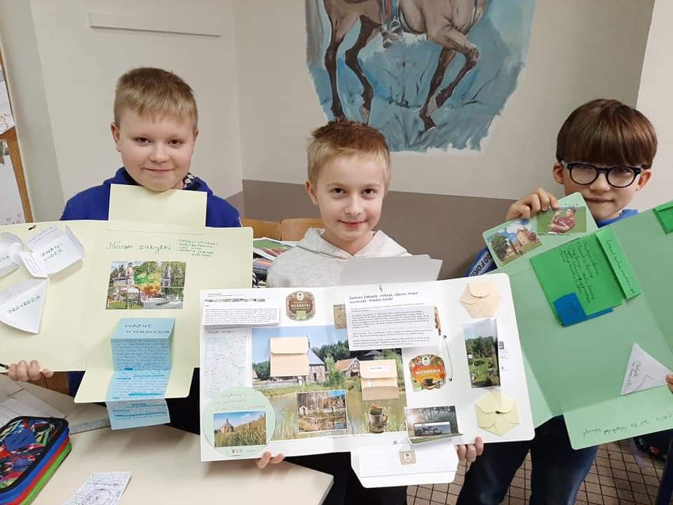 Podczas prezentacji lapbooków przed całą klasą opowiedzieli o położeniu swojej miejscowości, zabytkach, krajobrazie, przyrodzie, kuchni regionalnej i znanych osobach pochodzących z tego miejsca. Poznaliśmy też wiele lokalnych ciekawostek!
