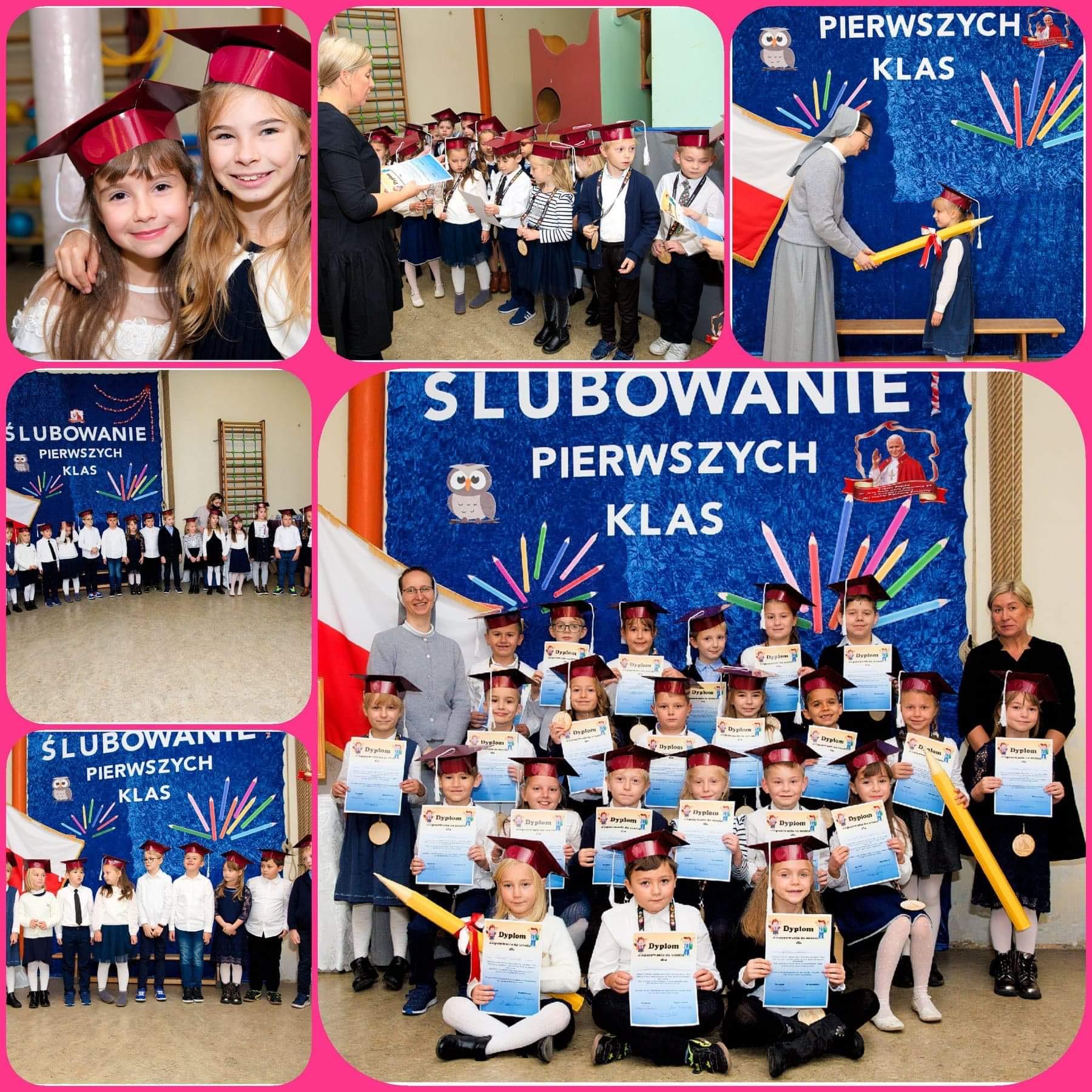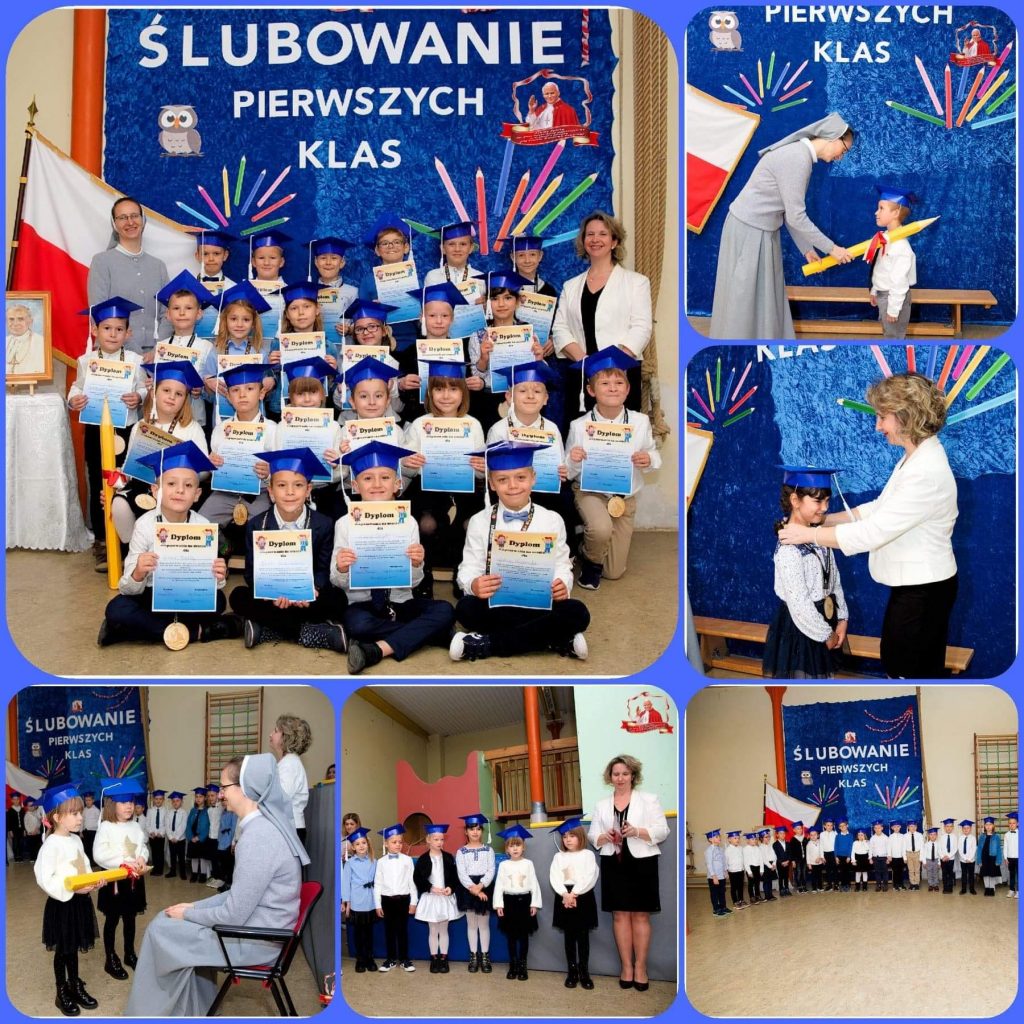 Następnie kierownik szkoły, s. Aleksandra Pietruszewska, dokonywała symbolicznego pasowania na ucznia. Z rąk wychowawców uczniowie otrzymali pamiątkowe medale, dyplomy i upominki. Były też życzenia od starszych kolegów, rodziców i nauczycieli. Każda klasa miała prawdziwą sesję fotograficzną.