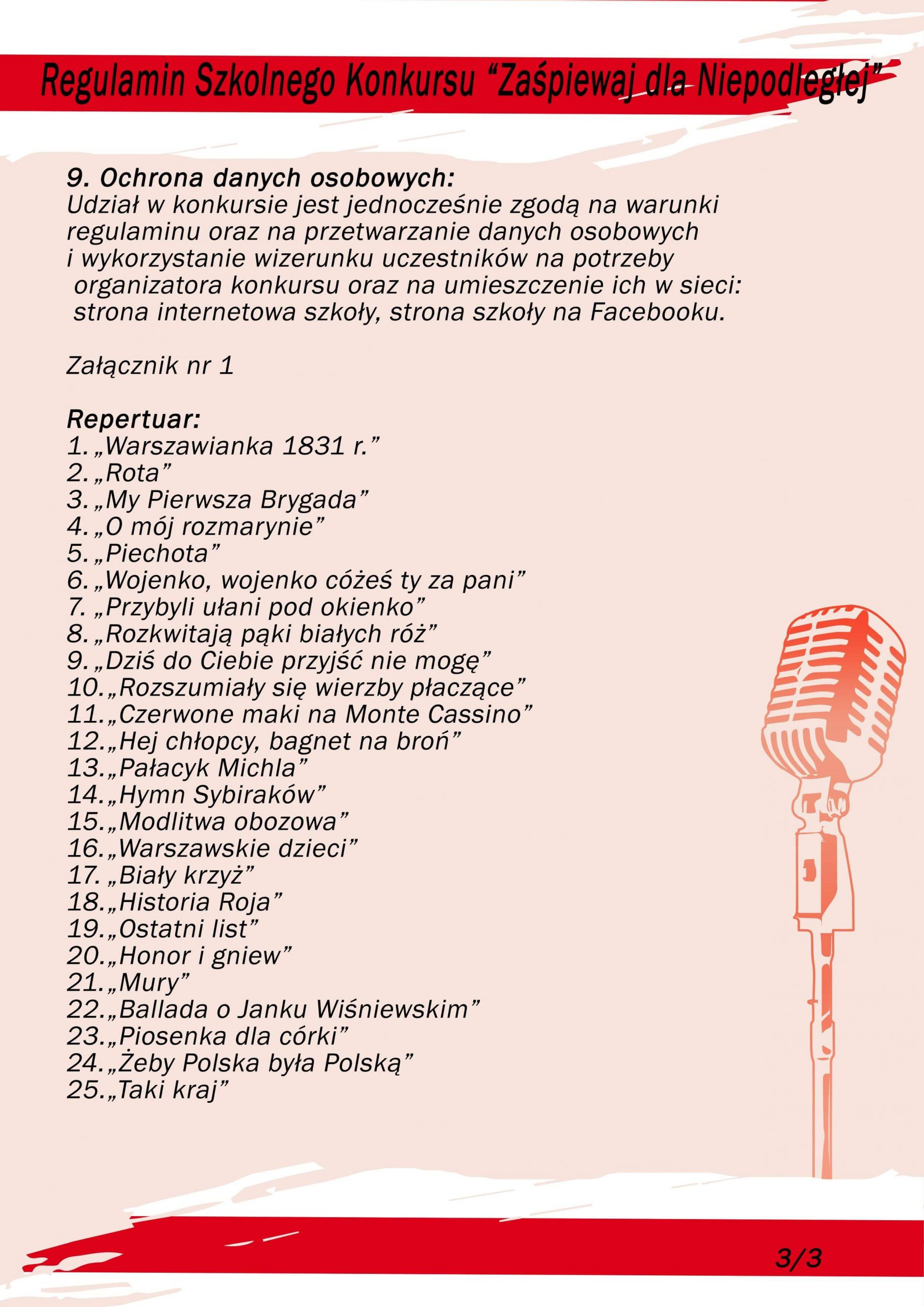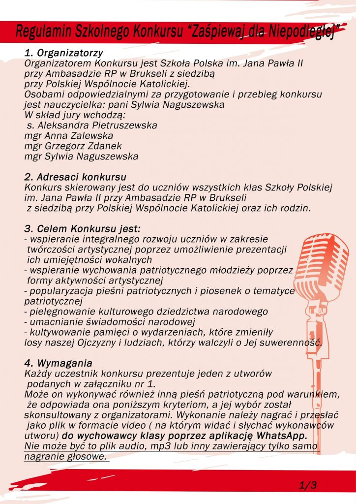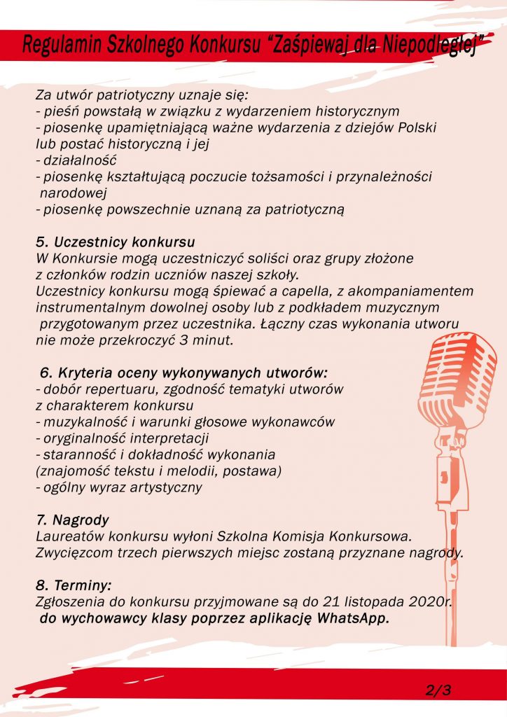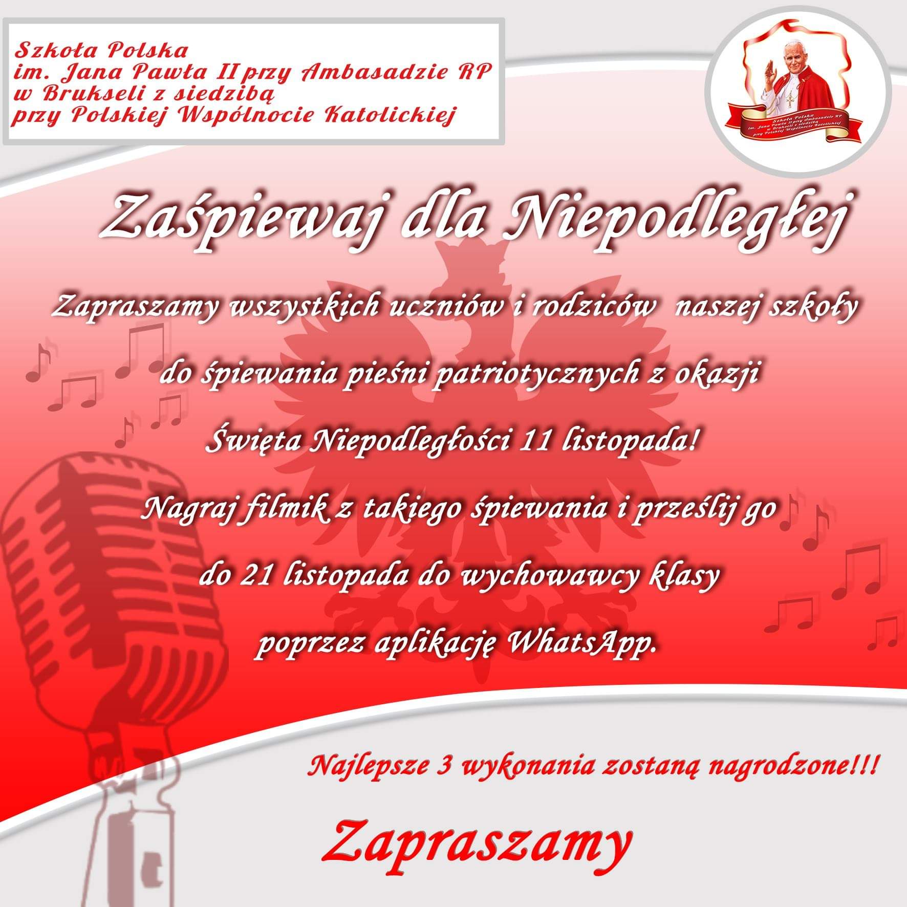 UWAGA! Do końca listopada został przedłużony termin nadsyłania pieśni patriotycznych na konkurs „Zaśpiewaj dla Niepodległej”. Serdecznie zapraszamy naszych uczniów i ich rodziny do wzięcia udziału w konkursie!